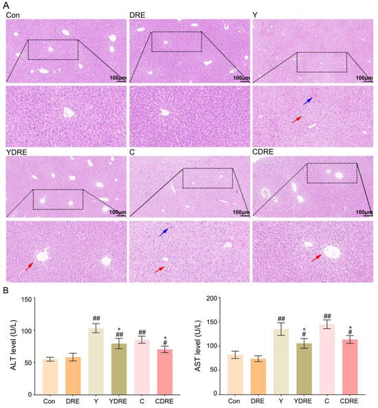 3.2.1. DRE Alleviated Liver Histological Injury in Mice Exposed to Y or C