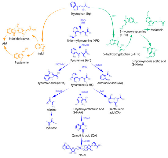 L-tryptophan metabolite pathway. The full names of the abbreviations in the Figure 2 are as follows: TPH—Trp hydroxylase; IDO—indoleamine-2,3-dioxygenase; TDO—Trp-2,3-dioxygenase; AFMID—arylformamidase; KAT—KYN aminotransferases; KYNU—kynureninase; KMO—kynurenine-3-monooxygenase; HAAO—3-hydroxyanthranilate-3,4-dioxygenase; QAPRT—QA phosphoribosyltransferase; AhR—aryl hydrocarbon receptor.