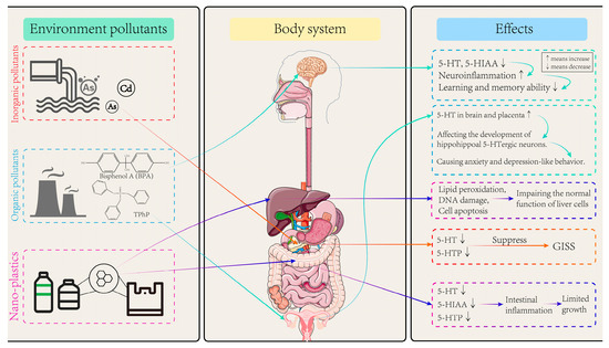 Several studies have shown that the exposure of adult specimens of D. rerio and P. fluviatilis to polypropylene microplastics (PP-MPs, 8–10 μm in size) at doses of 1 and 10 mg/g via water exposure for 21 days interferes with Trp metabolism in the liver, resulting in reduced metabolite levels, lipid peroxidation, DNA damage, and cell apoptosis, thereby impairing the normal function of liver cells [84]. A study has shown that when humans are exposed to excessive amounts of nano-plastics, nano-plastics enhance the hydrophobicity around the aromatic residues of tryptophan to effectively bind and change the conformation of human hemoglobin (Hb) [85]. It was found that, after exposing zebrafish embryos to 44 nm polystyrene nanoplastics (PS–NPs) at doses of 1, 10, 100 μg/L via water for 30 days, intestinal inflammation was activated, the levels of 5-HIAA, 5-HT, and 5-HTP were reduced, and the growth and development of juvenile fish were limited [86]. Through a molecular docking simulation, it was found that there is a strong affinity between polystyrene nanoplastics and Trp [87]. Additionally, mixed exposure to 2 mg/L of microplastics and heavy metals via water for 30 days can cause oxidative stress in zebrafish gills, damage the pathway of 5-HT production, and promote cell apoptosis [88]. Given the ubiquity of microplastics in food and water, future policies should prioritize reducing plastic waste, improving detection methods, and establishing safe exposure thresholds to safeguard public health. Species, dose, routes, and length of exposure of references in Section 4 are shown in Table 2.
