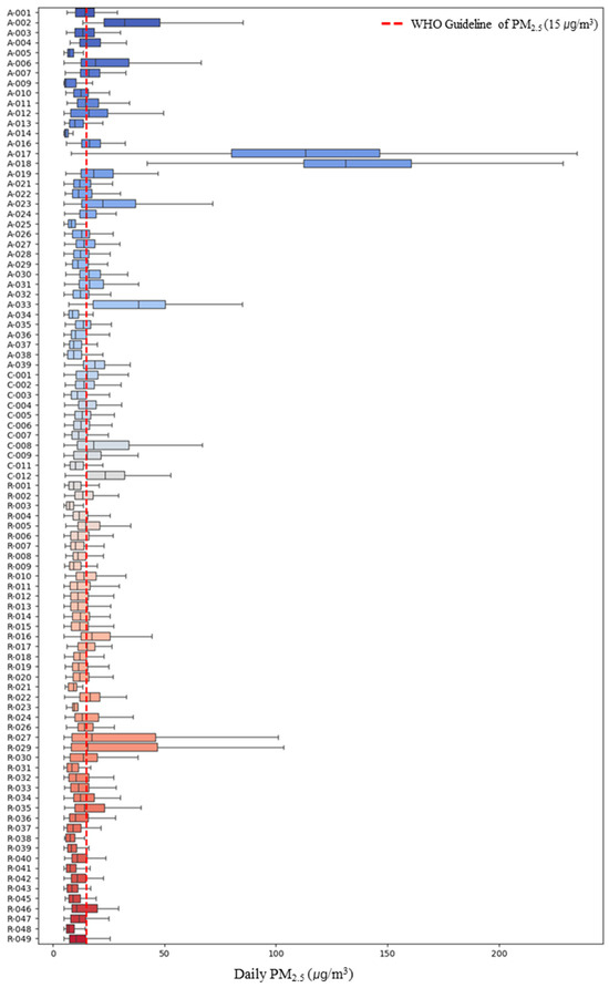 The personal PM2.5 exposure concentration of the study participants was found to be 17.38 μg/m3, with personal exposure concentrations on weekends (17.42 μg/m3) being higher than on weekdays (17.36 μg/m3). However, the difference in mean concentrations between weekdays and weekends was not statistically significant (p > 0.05). Upon examining the personal PM2.5 exposure concentrations of the study participants (Figure 1), a wide variation in concentrations between participants was observed. Among asthma patients, participant A-018 exhibited the highest personal exposure concentration at 138.29 ± 46.00 μg/m3, the highest among all participants. Additionally, the number of days exceeding the current 24-h PM2.5 exposure health guideline of 15 μg/m3 of WHO was 6790 out of the total monitored period of 19,162 days across all participants [30], accounting for approximately 35%. Furthermore, 40 out of the 93 participants (representing 43%) had daily average concentrations exceeding the WHO guideline.