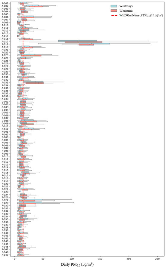 Upon examining personal PM2.5 exposure concentrations by weekday and weekend (Figure 2), it was found that personal PM2.5 exposure concentrations varied between weekdays and weekends depending on the participant. For 39 participants, weekday concentrations were higher, while for 54 participants, weekend personal exposure concentrations were higher. For participant A-018, who exhibited the highest personal exposure concentration, weekday and weekend concentrations were 139.60 ± 47.71 μg/m3 and 135.00 ± 42.29 μg/m3, respectively, indicating higher weekday concentrations but with no significant difference. In the case of R-032, the largest difference between weekday and weekend concentrations was observed, with weekday concentrations at 32.08 ± 74.12 μg/m3 and weekend concentrations at 11.26 ± 5.29 μg/m3, showing weekday concentrations approximately 2.9 times higher than those on weekends. Conversely, for A-016, weekday concentrations were 15.75 ± 5.29 μg/m3 and weekend concentrations were 25.39 ± 11.37 μg/m3, indicating that weekend exposure concentrations were approximately 1.5 times higher than those on weekdays. Therefore, to account for these individual differences, we considered weekday/weekend as a variable in the linear mixed-effects model.