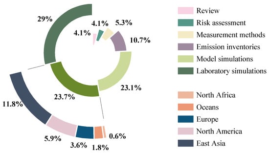In this study, 151 valid articles were obtained through a search using the core terms “intermediate volatile organic compounds (IVOCs)”, “polycyclic aromatic hydrocarbons (PAHs)” and “risk assessment” in the Web of Science and China Knowledge Network (CNKI) databases, and excluding non-peer-reviewed papers and conference abstracts. These articles cover reviews, emission inventories, field observations, lab simulations, model simulations, risk assessments, and detection methods, and the geographical scope of the field observations spans East Asia, North America, Europe, North Africa, and oceans, forming a full-chain evidence system for “emission–exposure–transformation–risk” (Figure 1).