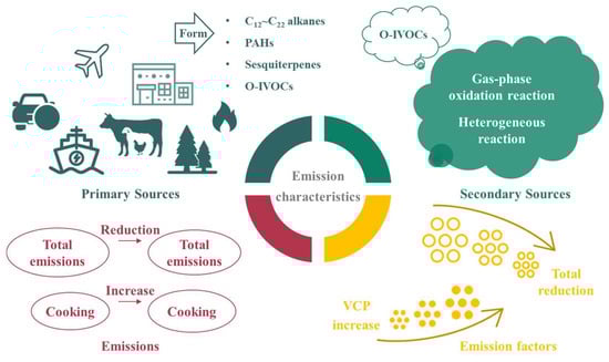 IVOCs have extensive sources, mainly including primary emissions and secondary formations (Figure 2). Primary emissions are from anthropogenic and biogenic sources, involving fossil fuel combustion (e.g., motor vehicle exhausts, ship and aircraft emissions) [26,27,28], biomass combustion (e.g., wood and straw combustion, and garbage incineration) [29], industrial processes (e.g., chemical production and paint use) [30], catering [31], animal husbandry and plant emissions (e.g., terrestrial higher plants, aquatic plants, and phytoplankton) [32]. Secondary formations of IVOCs mainly occur via atmospheric chemical reactions. In gas-phase oxidation reactions, VOCs react with hydroxyl radicals (OH·), the ozone (O3), or nitrate radicals (NO3·) to form intermediate products like peroxy radicals (RO2·) and epoxides. These intermediate products further react to generate low-volatility compounds, which are partially converted into IVOCs. Additionally, RO2· can undergo auto-oxidation to form low-volatility peroxides and hydroperoxides, and these products partially belong to IVOCs [7]. In regard to heterogeneous reactions, IVOCs react with sulfate ions on the surface of acidic particulate matter to form low-volatility compounds, such as sulfate esters, or undergo photochemical reactions on particle surfaces or in droplets under light to generate low-volatility compounds [33,34], promoting the secondary formation of IVOCs.