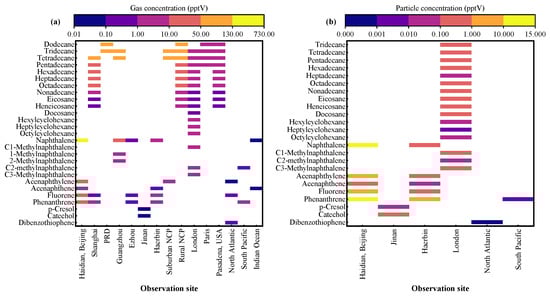 Atmospheric concentrations (pptV) of (a) gas-phase and (b) particulate-phase IVOCs at different observation sites [11,32,36,68,69,70,71,72,73,74]. PRD refers to the Pearl River Delta region in China, and NCP refers to the North China Plain (NCP) region in China.