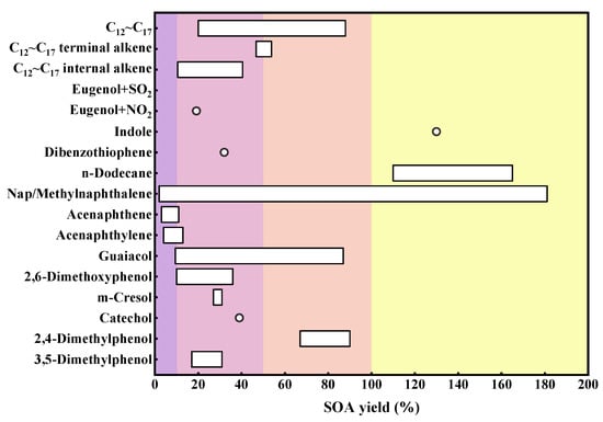 The SOA yield of certain components within IVOCs based on multi-laboratory studies. The white dots in the figure indicate individual values, while the columns illustrate a range of values. Purple indicates a yield of 0–10%, pink indicates a yield of 10–50%, orange indicates a yield of 50–100%, and yellow represents the yield exceeds 100%.