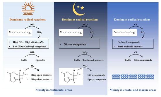 The process of IVOC oxidation leading to SOA formation involves complex chemical reaction mechanisms. Currently, research in this field remains relatively limited, with mechanism exploration primarily conducted through laboratory simulations. The current research on SOA formation pathways mainly focuses on the chain oxidation processes of long-chain alkanes, the cyclic structure transformation mechanisms of PAHs, and the formation pathways of oxidation products from sesquiterpenes (represented by β-caryophyllene) (Figure 5). Long-chain alkanes generate SOAs in the atmosphere through reactions with different oxidants, with the oxidation mechanisms varying depending on the type of oxidant [7]. The reactions of long-chain alkanes with OH· typically occur during the daytime, beginning with the abstraction of hydrogen atoms from alkane molecules by OH· to form alkyl RO2. In low NOx conditions, RO2 mainly reacts with HO2 to form peroxides (ROOH). ROOH can generate various products through reactions with OH· or photolysis, including carbonyl compounds and dihydroxy peroxides, which may further participate in the formation of atmospheric particulate matter. In high NOx conditions, RO2 mainly reacts with NO to form alkyl nitrates (AN) and alkoxy radicals (RO). RO can further decompose or react with O2 to form carbonyl compounds, which tend to remain in the gas phase, thereby reducing particle formation. The reaction of long-chain alkanes with Cl atoms mainly occurs during the day in coastal and marine regions. Cl atoms initiate the oxidation process by abstracting hydrogen atoms, generating RO2, which reacts with RO2 to form RO. RO mainly reacts with O2 to form carbonyl compounds or decomposes to produce small molecules with higher volatility, contributing relatively less to SOAs. Additionally, although the reaction of long-chain alkanes with NO3· is relatively slow, it is still significant due to the higher concentration of NO3· in the nighttime atmosphere. The products generated from the reaction of long-chain alkanes with NO3 radicals are mainly nitrate compounds, which have lower volatility and can significantly enhance SOA formation. PAHs primarily generate epoxides, nitro compounds, and chlorinated products through reactions with OH·, NO3·, and Cl atoms [92,93,94,95,96,97,98]. For example, acenaphthene reacts with OH· to form acenaphthenyl radicals, which can further react with O2 to generate peroxy radicals, ultimately forming low-volatility products that promote SOA formation. The reaction of acenaphthene with NO3· generates NO3-acenaphthene adducts, which can decompose to form 2,3-epoxyacenaphthene and 4,5-epoxyacenaphthene. The reaction of acenaphthene with Cl atoms produces chlorinated products, such as 2-chloroanthracen-1-one and 1-chloropyren-2-one. Sesquiterpenes like β-caryophyllene mainly generate cyclic and ring-opening products through reactions with O3 and NO3, such as β-caryophyllone aldehyde, β-norcaryophyllone aldehyde, β-caryophyllonic acid, and β-nocaryophyllonic acid [99]. These products further react in the atmosphere to form low-volatility substances, promoting SOA formation. Additionally, the products generated from the reaction of β-caryophyllene with NO3 include nitro compounds and epoxides, such as 1-nitroanthracene and 9-nitroanthracene. These products, with their high stability and low volatility in the atmosphere, significantly contribute to SOA formation.
