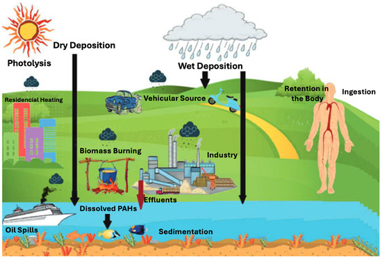 Upon formation, PAHs enter the atmosphere either in gaseous form or bound to particulate matter [14]. LMW-PAHs remain in the vapor phase, while HMW-PAHs adsorb to particulate matter, facilitating long-range transport (LRT) [15,16]. These atmospheric PAHs are subsequently deposited onto terrestrial and aquatic environments through wet and dry deposition processes [3]. Figure 1 illustrates the dynamics of PAHs in the environment, highlighting their mobility upon deposition on terrestrial surfaces [17], driven by runoff and weathering processes, and their subsequent transport into freshwater systems [18].