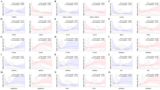 Associations of 15 urinary VOC metabolites, including 2MHA (A), 3MHA+4MHA (B), AAMA (C), AMCC (D), ATCA (E), BMA (F), CEMA (G), CYMA (H), DHBMA (I), 2HPMA (J), 3HPMA (K), MA (L), MHBMA3 (M), PGA (N), and HPMMA (O), and circadian syndrome in a restricted cubic spline model stratified by menopausal status. The multivariate adjusted OR (solid blue line for premenopausal, solid red line for postmenopausal) and 95% CI (shaded area) for associations between urinary VOC metabolites and circadian syndrome. Models were adjusted for age, race, poverty income ratio, smoker, physical activity, education level, drinker, and marriage status. OR—odds ratio; VOCs—volatile organic compounds.