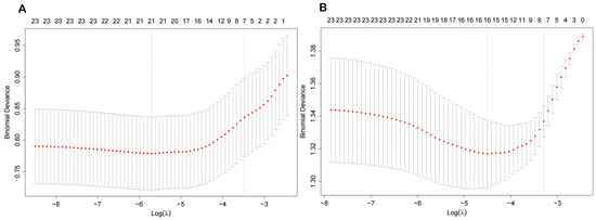 The 10-fold cross-validation curves between log-transformed LASSO penalty parameter (λ) and variables in premenopausal (A) and postmenopausal (B). The independent variables are ln-transformed 15 VOCs. Covariates include age, race, poverty income ratio, smoker, physical activity, education level, drinker, and marriage status. The left black dotted line is the optimal value of λ at which the minimum binomial deviance is calculated, while the right black dotted line is the value of λ in the simplest model obtained at one standard error of the minimum binomial deviance. LASSO—least absolute shrinkage and selection operator; VOCs—volatile organic compounds.