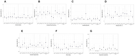 The adjusted odds ratio and its corresponding 95% CI for the seven components of circadian syndrome, including central obesity (A), elevated blood pressure (B), elevated glucose (C), reduced HDL-C (D), elevated triglycerides (E), short sleep (F), and depression symptoms (G) with urinary VOC metabolites. Models were adjusted to include age, race, poverty income ratio, smoker, physical activity, education level, drinker, and marriage status. CI—confidence interval; HDL-C—high density lipoprotein cholesterol; OR—odds ratio; VOC—volatile organic compound.