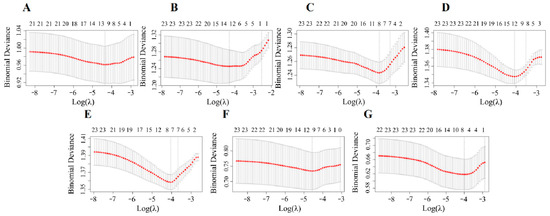 The 10-fold cross-validation curves between log-transformed LASSO penalty parameter (λ) and variables. The independent variables are ln-transformed 15 VOCs. Covariates include age, race, poverty income ratio, smoker, physical activity, education level, drinker, and marriage status. Central obesity (A), elevated blood pressure (B), elevated glucose (C), reduced HDL-C (D), elevated triglycerides (E), short sleep (F), and depression symptoms (G) were examined as dependent variables, respectively. The left black dotted line is the optimal value of λ at which the minimum binomial deviance is calculated, while the right black dotted line is the value of λ in the simplest model obtained at one standard error of the minimum binomial deviance. HDL-C—high density lipoprotein cholesterol; LASSO—least absolute shrinkage and selection operator; VOCs—volatile organic compounds.