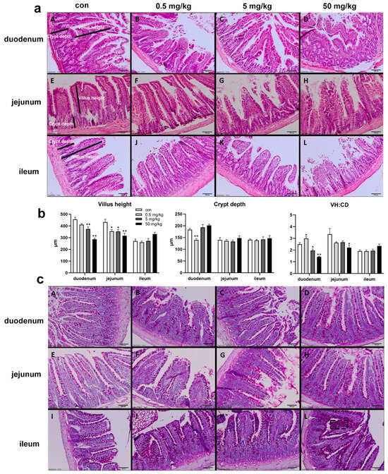 The HE staining results of the small intestinal mucosa showed normal mucosal morphology with intact villi in the control group (Figure 1a). In the BPA-treated groups, varying degrees of small intestinal damage were observed, including villous injury, central necrosis, epithelial shedding, lamina propria disintegration, hemorrhage, and ulcer formation. The interstitial tissue exhibited congestion, edema, and neutrophil infiltration, with epithelial cell degeneration and necrosis at the villous tips (Figure 1a). Compared to the control group, the duodenal villus height was significantly reduced in the 5 mg/kg and 50 mg/kg BPA-treated groups (p < 0.05), while crypt depth was significantly increased in the 0.5 mg/kg BPA-treated group (p < 0.05), with no significant differences observed in other dosage groups (Figure 1b). The villus-height-to-crypt-depth ratio decreased significantly across 5 and 50 mg/kg BPA-treated groups (p < 0.05). In the jejunum, villus height was significantly reduced in all BPA-treated groups compared to the control (p < 0.05), with no significant changes in crypt depth. However, the villus-height-to-crypt-depth ratio was significantly reduced in the 50 mg/kg BPA-treated group (p < 0.05). BPA exposure did not cause significant changes in villus height, crypt depth, or the villus height-to-crypt depth ratio in the ileum at any tested dosage (Figure 1b). Furthermore, PAS staining under electron microscopy revealed a marked increase in goblet cell numbers in the intestinal epithelium of BPA-treated rats compared to the control group (Figure 1c).
