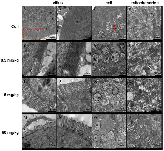 BPA on the ultrastructure of rat jejunum. (A–D) Control; (E–H) 0.5 mg/kg; BPA-treated rat; (I–L) 5 mg/kg BPA-treated rat; (M–P) 50 mg kg BPA-treated rat. The red dashed box indicates villus in A. The red arrow indicates cell in C. The white arrow indicates cytoplasmic vacuoles. n = 6.