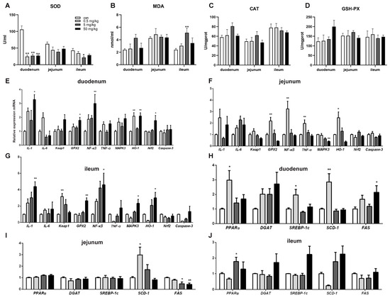 BPA on oxidative stress parameters, inflammatory and lipid metabolism genes in rat small intestine tissue. (A–D) Oxidative stress parameters SOD, MDA, CAT, and GSH-PX; (E–G) duodenum, jejunum, and ileum inflammatory genes; (H–J) duodenum, jejunum, and ileum lipid metabolism genes. n = 6. * represents significant differences, p < 0.05. ** represents highly significant differences, p < 0.01.