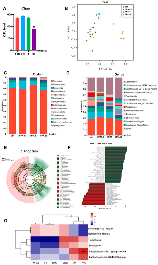 Compared with the control group, the fecal microbiota of rats treated with 50 mg/kg BPA exhibited significantly reduced α-diversity and distinct β-diversity clustering (Figure 4A,B, p < 0.05). At the phylum level, the relative abundance of Firmicutes increased in the 5 mg/kg BPA group, while Tenericutes and Proteobacteria were more abundant in the 50 mg/kg BPA group. Conversely, Bacteroidetes showed decreased relative abundance in both the 5 mg/kg and 50 mg/kg BPA treatment groups (Figure 4C). At the genus level, BPA significantly decreased the relative abundance of Lachnospiraceae NK4A136 group, Bacteroidales S24-7 group_norank, Romboutsia, Aerococcus, Turicibacter, and several unclassified genera (p < 0.05). Meanwhile, the relative abundances of Streptococcus, Escherichia-Shigella, and No-rank Mollicutes increased notably (Figure 4D). Linear discriminant analysis (LDA) identified Lachnospiraceae NK4A136 group, Bacteroidales S24-7 group_norank, Romboutsia, Turicibacter, Escherichia-Shigella, and No-rank Mollicutes as the most contributive taxa (Figure 4E,F). Among these, Lachnospiraceae NK4A136 group and Bacteroidales S24-7 group_norank were significantly positively correlated with V/C, while Romboutsia was negatively correlated with IL-1 and GPX2 (Figure 4G).