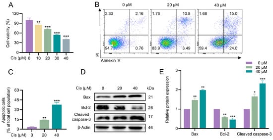 Cisplatin impaired cell viability and induced cell apoptosis in KGN cells. KGN cells were exposed to varying concentrations of cisplatin for 24 h. (A) The CCK-8 assay was utilized to ascertain relative cell viability. (B,C) Flow cytometry was employed to detect the apoptotic effects of cisplatin on KGN cells, with subsequent quantification of the apoptotic rates. (D,E) Western blot analysis was conducted to identify apoptosis-related proteins, including Bax, Bcl-2, and Cleaved caspase-3. The densitometric values of the bands were standardized with respect to β-Actin as an internal control. The results are presented as the mean ± standard deviation from at least three independent experimental repetitions. Significant differences from the control groups are denoted by an asterisk “*”, with statistical significance levels of * p < 0.05, ** p < 0.01, and *** p < 0.001.