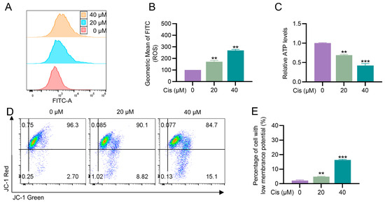 As central regulators of cellular metabolism and key determinants of cell fate, mitochondria play pivotal roles in maintaining cellular health, and their dysfunction has been implicated in various disease processes [24]. We therefore examined whether cisplatin affected mitochondrial function in KGN cells. We first measured intracellular ROS levels to assess oxidative stress. The results showed a dose-dependent increase in ROS production in cisplatin-treated cells compared to the control group (Figure 2A,B). Next, we evaluated the impact of cisplatin on mitochondrial function by assessing ATP production and mitochondrial membrane potential (MMP). Cisplatin treatment at 20 μM and 40 μM significantly reduced ATP levels by 31% and 57%, respectively (Figure 2C). Furthermore, cisplatin exposure led to a marked increase in the proportion of cells with depolarized mitochondria, as indicated by a reduction in MMP (Figure 2D,E). These findings demonstrate that cisplatin triggers oxidative stress and disrupts mitochondrial function in KGN cells, as evidenced by elevated ROS levels, reduced ATP production, and mitochondrial depolarization.