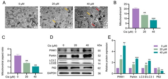 Cisplatin induced mitophagy in KGN cells. (A) Ultrastructure of mitochondria in KGN cells. Red arrows indicate mitochondrial autophagosomes. Yellow arrows indicate autophagic lysosomes. “M” indicates mitochondria, “N” indicates nucleus, and “RER” indicates rough endoplasmic reticulum. The scale bar is 1 μm. (B) Quantification of mitochondrial number. (C) Mitochondrial length/width ratio. (D,E) Protein levels of PINK1, Parkin, LC3I, LC3II, and P62 were detected using Western blot. GAPDH was used to normalize the densitometric values of the bands. “*” indicates a significant difference compared with the control group (* p < 0.05, ** p < 0.01, and *** p < 0.001).