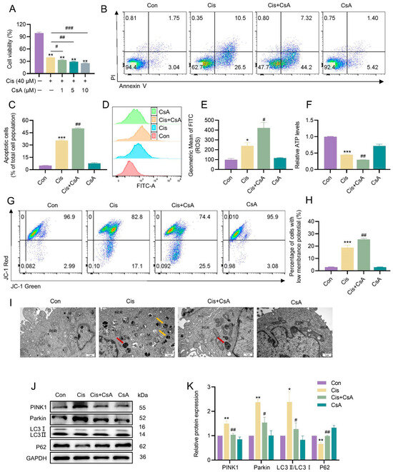 Given the demonstrated activation of mitophagy by cisplatin in KGN cells, we investigated the specific role of mitophagy in cisplatin-induced apoptosis and mitochondrial damage. Mitophagy was inhibited by cyclosporine A (CsA), a mitophagy inhibitor. Compared to the cisplatin-only group, CsA treatment further reduced cell viability (Figure 4A) and increased apoptosis rates (Figure 4B,C). Additionally, CsA exacerbated mitochondrial dysfunction, as evidenced by elevated intracellular ROS levels (Figure 4D,E), further suppressed ATP production (Figure 4F), and accelerated the loss of MMP (Figure 4G,H). TEM analysis revealed a significant decrease in autophagosomes and autophagolysosomes in CsA-treated cells (Figure 4I). Consistent with these findings, CsA downregulated the expression of key mitophagy-related proteins, including LC3II/LC3I, Parkin, and PINK1, while upregulating P62 levels (Figure 4J,K).