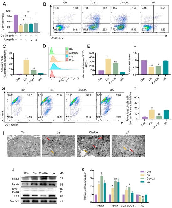 UA enhanced mitophagy and protected KGN cells from cisplatin-induced mitochondrial damage and apoptosis. (A) The CCK-8 assay was employed to assess the impact of cisplatin and UA on the viability of KGN cells, expressed as relative percentages. (B,C) Apoptosis was detected using flow cytometry in the cells of different treatment groups, and the apoptosis rate was quantified. (D,E) Intracellular ROS levels were detected using flow cytometry. (F) The detection of ATP content. (G,H) The detection of MMP using flow cytometry. (I) TEM analysis of the mitochondrial ultrastructure. The red arrows indicate mitochondrial autophagosomes. The yellow arrows indicate autophagic lysosomes. “M” indicates mitochondria, “N” indicates nucleus, and “RER” indicates rough endoplasmic reticulum. The scale bar is 1 μm. (J,K) Western blot analysis was utilized to detect the protein abundance of mitophagy-related factors, including PINK1, Parkin, LC3I, LC3II, and P62. The densitometric values of the bands were standardized concerning GAPDH as an internal control. The results are presented as the mean ± standard deviation from at least three independent experimental repetitions. Asterisks “*” denote statistically significant differences when compared to the controls, with thresholds set at * p < 0.05, ** p < 0.01, and *** p < 0.001. Meanwhile, a hash symbol “#” marks significant deviations from the cisplatin group, with # p < 0.05 and ## p < 0.01 indicating the levels of significance.
