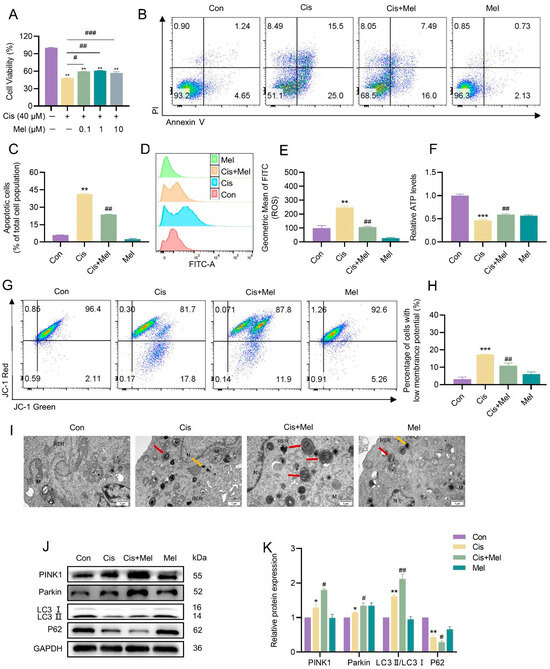 Cisplatin (HY-17394), Urolithin A (HY-100599), Cyclosporin A (HY-B0579), DMSO (HY-Y0320), and DMF (HY-Y0345) were purchased from MedChemExpress (Monmouth Junction, NJ, USA). Melatonin (CAS 73-31-4, purity ≥ 98%) was purchased from Sigma Aldrich (St. Louis, MO, USA). The primary antibodies included Anti-Bax (1:1000, D2E11, CST, Danvers, MA, USA), Anti-Bcl2 (1:1000, 15071S, CST, Danvers, MA, USA), Cleaved caspase-3 (1:500, 9664L, CST, Danvers, MA, USA), Anti-beta-Actin (1:1000, 3700S, CST, Danvers, MA, USA), Anti-PINK1 (1:2000, 23274-1-AP, Proteintech, Wuhan, China), Anti-Parkin (1:1000, 14060-1-AP, ZEN-BIOSCIENCE, Chengdu, China), Anti-LC3II/LC3I (1:1000, 12741S, CST, Danvers, MA, USA), Anti-P62 (1:1000, 29503-1-AP, Proteintech, Wuhan, China), and Anti-GAPDH (1:1000, 10494-1-AP, Proteintech, Wuhan, China). Secondary antibodies, including anti-rabbit (1:10,000, SA00001-2) and anti-mouse (1:10,000, SA00001-1), were obtained from Proteintech (Wuhan, China).