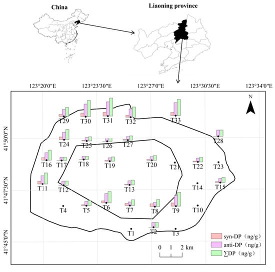 Syn-DP, anti-DP, and ∑DP concentrations in soil samples (ng/g dry weight).