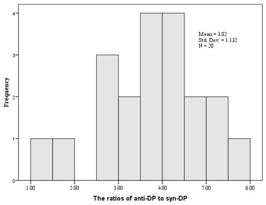 Anti-DP concentrations (27.01 ± 14.32 ng/g) were consistently greater than syn-DP (8.57 ± 4.55) in soil samples. It was consistent with the previous studies [,], relating to the facts that anti-DP occupied most of the proportion in the commercial DP product (about 75–80%), microbial degradation, and migration capability [,]. The ratios of anti-DP to syn-DP were 1.50–5.99 and obeyed a normal distribution (Kolmogorov–Smirnov Z = 0.372, Asymp. Sig. (two-tailed) = 0.999) (Figure 2).