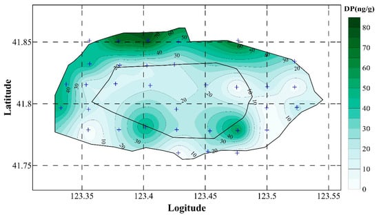 Although there has been a dearth of research on DP in soil, DP concentration has been reported in previous research. Mean DP concentrations in soil samples (n = 3) in Harbin City, an urban region in northeastern China, were reported as 0.01 ng/g []. DP concentrations were ND to 47.7 ng/g, with a mean of 7.26 ng/g, in surface soils (n = 26) from Qingyuan, South China []. DP in soil samples of Jingjin region (n = 7), Shandong Province (n = 27), Hebei Province (n = 29), and Shanxi Province (n = 24) were detected, and mean concentrations were 1.10 ± 2.61, 0.96 ± 2.66, 0.10 ± 0.14, and 0.96 ± 2.66 ng/g, respectively []. DP concentration was 0.665–102 ng/g, with a mean of 15.9 ng/g, in surface soil samples (n = 8) of Huai’an City []. Compared to previous studies, the mean DP concentration in this study was relatively higher. This is presumably due to the sampling sites being mainly located in a densely populated urban region.