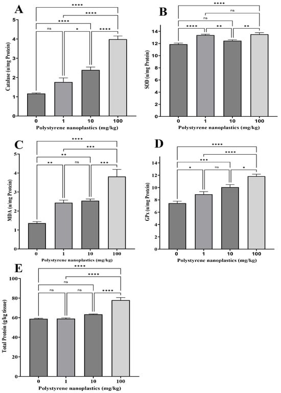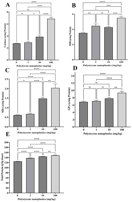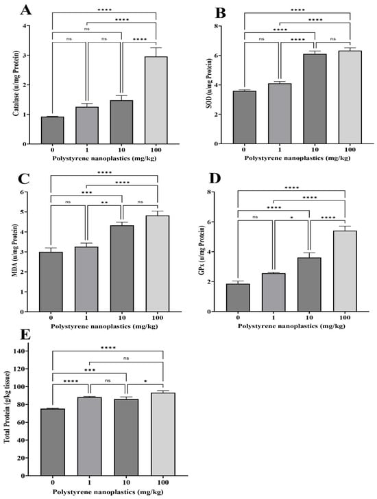 Oxidative stress biomarker activity: (A) CAT, (B) SOD, (C) MDA, (D) GPX, and (E) total protein in kidneys of Goldfish exposed to NPs. All data are presented as mean ± SD, * p < 0.05, ** p < 0.01, *** p < 0.001, **** p < 0.0001, and ns p > 0.05.