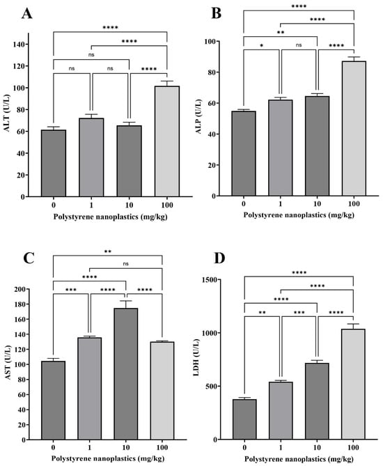 Biochemical enzyme activity: (A) ALP, (B) ALT, (C) AST, and (D) LDH in plasma of Goldfish exposed to NPs. All data are presented as mean ± SD, * p < 0.05, ** p < 0.01, *** p < 0.001, **** p < 0.0001, and ns p > 0.05.