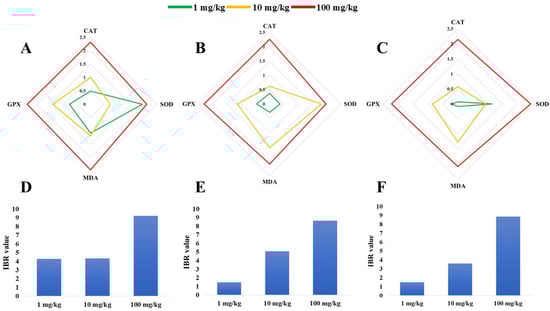 Radar plots of IBR in gill (A), kidney (B), and liver (C). IBR index of all tested biomarkers in gill (D), kidney (E), and liver (F).