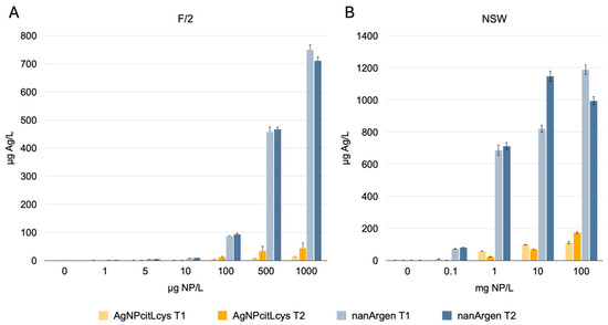 Ag concentration (µg/L) in (A) F/2 and (B) NSW upon incubation of AgNPcitLcys and nanArgen™ at, respectively, 0, 1, 5, 10, 100, 500, and 1000 µg/L and 0, 0.1, 1, 10, and 100 mg/L of AgNPs. Results for 1 h of incubation (T1), 72 h of incubation for F/2, and 48 h of incubation for NSW (T2). Data shown as mean ± standard deviation.