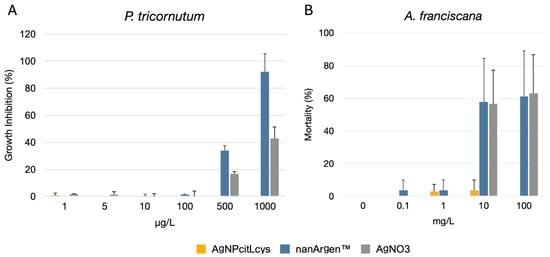(A) 72 h growth inhibition test of AgNPcitLcys (yellow), nanArgen™ (blue), and AgNO3 (gray) at 0, 1, 5, 10, 100, and 1000 µg/L with P. tricornutum; (B) 48 h mortality test of AgNPcitLcys (yellow), nanArgen™, (blue) and AgNO3 (gray) at 0, 0.1, 1, 10, and 100 mg/L with A. franciscana. Data shown as mean ± standard deviation.