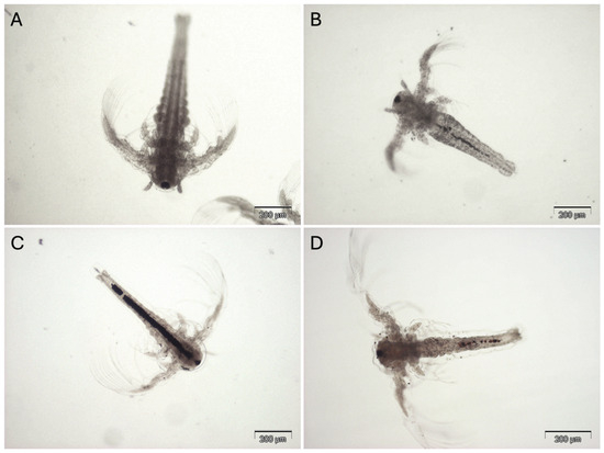 After 48 h, the surviving nauplii were counted under a stereomicroscope; larvae that were entirely immobile for 10 s were counted as dead, and mortality percentages were calculated. The test was replicated three times and considered acceptable if the controls had an average mortality of maximum 20%. The surviving specimens underwent rinsing with deionized water, followed by fixation in ethanol. Images were captured using the optical microscope Olympus BX51 (Tokyo, Japan) equipped with the digital camera Olympus DP-50 in conjunction with Olympus DP-SOFT software (version 3.1).