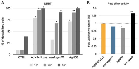 (A) NRRT expressed as % of destabilized cells of mussels exposed to 100 µg/L of AgNPcitLcys, nanArgen™, and AgNO3. Values are expressed as means ± SD out of 100 hemocytes scored. Asterisks above the bars show significant differences with control groups at each time point (* p < 0.05; ** p < 0.01). (B) P-gp efflux activity in gills of mussels exposed to 100 µg/L of AgNPcitLcys, nanArgen™, and AgNO3. Verapamil (VER, 1 µM) is shown as the positive control. Data shown as fold variation in RhB content compared to controls. Asterisks on the above the bars show significant differences with the respective control groups (* p < 0.05; ** p < 0.01).