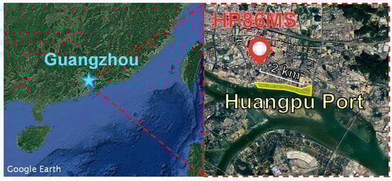 The sampling site was located at the Guangzhou Huangpu No. 86 Middle School (HP86MS), approximately 2 km from Huangpu Port (Figure 1). Huangpu Port, situated on the northern bank of the Pearl River in Guangzhou, is the largest coastal and maritime transport hub in southern China. The monitoring site is surrounded by dense traffic networks, industrial zones, and residential areas, making it subject to significant influences from industrial, vehicular, and domestic emissions. This location offers a representative setting for studying Guangzhou’s complex atmospheric environment. The monitoring period spanned from 1 January 2020 to 31 December 2021, covering two full years. In addition to single-particle aerosol monitoring, the dataset included meteorological parameters such as temperature, relative humidity, wind speed, and wind direction, as well as hourly concentrations of PM10, PM2.5, and gaseous pollutants. All monitoring instruments were regularly calibrated following national standards to ensure data accuracy and reliability.