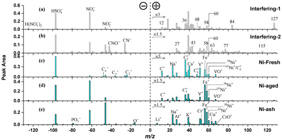 Positive and negative mass spectra of two interfering particle types (a,b) and nickel particles (c–e).