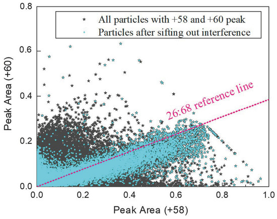 After eliminating interfering particles, the genuine nickel-containing particles amounted to around 32,000, representing 0.08% of the total detected particles. This proportion aligns well with the mass concentration-based estimates of nickel in atmospheric PM2.5 (0–0.15%) reported in previous studies [2,5,6,28]. Following the removal of interference, a significant change was observed in the peak area distribution at m/z = +58 and +60 in the nickel particle mass spectra. The natural isotope abundance of 58Ni and 60Ni are 68% and 26% of total nickel, respectively [29,30]. After interference removal, the peak area ratio of 58Ni+ to 60Ni+ closely matched this expected natural abundance ratio of 26:68 (Figure 3). This consistency validates the accuracy of the refined dataset, confirming that the remaining particles more reliably represent true nickel-containing aerosols.
