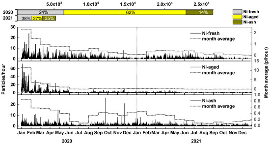 Particle number trends of three nickel particle types (left axis) and their monthly average trends (right axis). The two bars above indicate nickel particle numbers and respective percentages of the three types in 2020 and 2021.