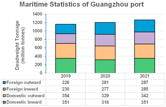 Maritime statistics of inward and outward ship traffic at Guangzhou port by million deadweight tonnage (DWT) from 2019 to 2021.