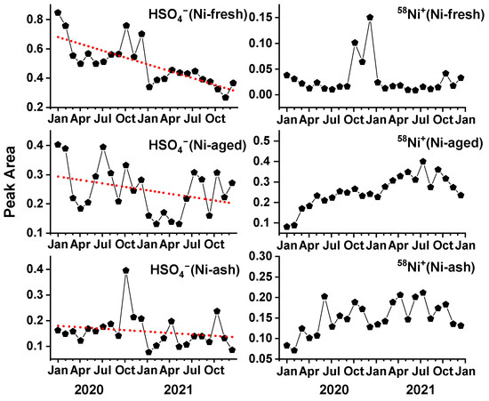 Mass spectra peak intensity (sulfate: 97HSO4−, nickel: 58Ni+) variations of three nickel particle types during the 2-year sampling period. The data points represent the monthly average peak area of nickel particles. Red dotted lines are linear fits of monthly data points.
