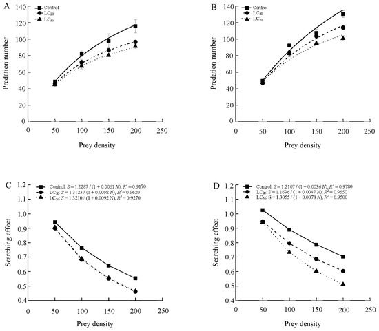 The functional responses of 1-day-old male and female adults of S. punctillum to two-spotted spider mite after being exposed to abamectin both conformed to the Holling-II model (Table 4 and Figure 1). Predation increased (number of prey eaten per predator per day) with prey density before stabilizing across all treatments, and the searching effects for males and females both declined with increased prey density. Compared to the control, exposure of beetles to abamectin residues from application rates equivalent to the LC20 and LC50 levels significantly inhibited the searching efficiency of both sexes.
