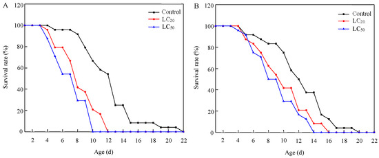 Survival curves of S. punctillum adults after exposure to lethal and sublethal concentrations of abamectin, for 1-day-old males (A) and females (B).