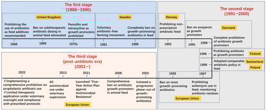 In restricting the use of veterinary antibiotics, European countries have emerged as trendsetters, consistently leading global efforts through stringent regulatory policies. The management of antibiotics for growth promotion or disease prevention in Europe has evolved through three primary stages (Figure 1).