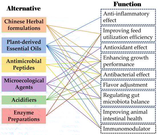 Alternative antibiotic products include Chinese herbal preparations, plant essential oils, antimicrobial peptides, microecological agents, acidifying agents, and enzyme preparations [,]. To restrict and reduce antibiotic use in animal production, research efforts are being directed toward two parallel strategies: (1) the development of novel antibiotics and (2) the advancement of antibiotic alternatives []. Growing environmental and public health concerns have propelled the emergence of green, non-toxic, and residue-free feed additives as both a prominent research focus and an industry development priority in modern animal husbandry [,]. This represents a critical challenge requiring urgent attention within the livestock sector. This study systematically evaluates several representative antibiotic alternatives, including Chinese herbal formulations, plant-derived essential oils, antimicrobial peptides, microecological agents, acidifiers, and enzyme preparations (Figure 2).
