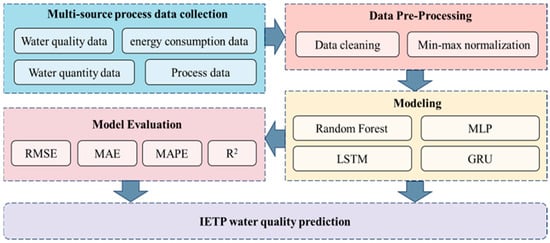 In this study, we introduce a research framework based on the fusion of multi-source data, designed for conducting comparative analyses of water quality in actual industry effluent treatment plant (IETP), as illustrated in Figure 1. The process is segmented into five distinct parts: (a) Initially, multi-source datasets within the IETP are collected; (b) These datasets are subsequently pre-processed to transform the data into a format suitable for computation; (c) Subsequently, the data are input into predictive models, which include machine learning models such as RF and deep learning models like MLP, LSTM, and GRU; (d) Finally, the performance of these models is evaluated to assess their efficacy.