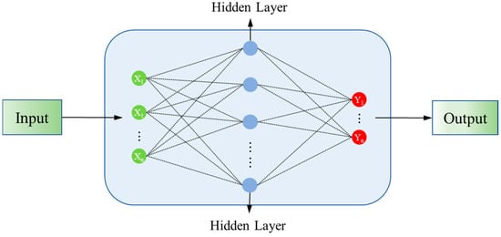 The MLP is a neural network composed of multiple perceptron units, consisting of multiple layers of perceptron units, as shown in Figure 3. The MLP consists of an input layer, several hidden layers, and an output layer. Each layer consists of multiple neurons that interact with each other through weighted connections []. The core design feature of the MLP is the ability of its hidden layers to process the output through a nonlinear activation function, allowing the network to learn and approximate nonlinear and complex function mappings. This network structure has shown remarkable adaptability and efficacy in handling classification and regression problems. In MLP, the weights and biases are used as the trainable parameters of the network, which are optimised by stochastic gradient descent (SGD) method during the training process. The output of the neuron is calculated by the following equation: