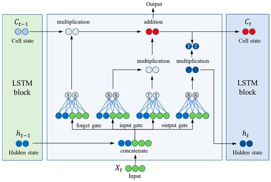 LSTM is a variant of recurrent neural networks (RNNs) specifically designed to address the problem of gradient vanishing or gradient explosion that standard RNNs may encounter when dealing with long-term data dependencies []. The key innovation of LSTM lies in its complex internal structure, shown in Figure 4, which consists of three distinctive gate control mechanisms: Forget Gate, Input Gate, and Output Gate as well as a unit to maintain long-term state. These mechanisms work in concert to precisely control the flow of information, enabling the network to efficiently capture and maintain long-term dependencies in sequential data. Each LSTM unit can be viewed as a miniature neural network module containing multiple control systems with gate control mechanisms that utilise nonlinear activation functions and element-by-element multiplication to determine whether information is retained or forgotten. The following is an operational and mathematical representation of the main components of the LSTM unit: