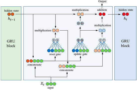 GRU is an efficient neural network structure for long-term dependency problems in recurrent neural networks (RNNs). Similarly to LSTM, GRU controls the information flow through a special gating mechanism, but its structure is relatively more simplified []. The structure of GRU is shown in Figure 5, which usually only contains two gates: the update gate and reset gate. This simplified design not only reduces the number of parameters, but also improves the computational efficiency, which enables GRU to match or outperform LSTM in some tasks. The essence of GRU lies in how it integrates new input information with past memories through the gating mechanism, and the following are the main components of the GRU unit and their mathematical expressions: