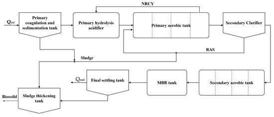 The data used in this study were obtained from an IETP located in the circular economy park of Huizhou District, Anhui Province, China. This IETP is designed to treat 5000 m3/d of industrial and domestic wastewater from the park. The treatment process consists of several stages, as shown in Figure 6, including primary coagulation and sedimentation, biological treatment, MBR technology, and final sedimentation, effectively treating wastewater through chemical and biological methods to ultimately produce clean effluent. In the primary sedimentation tank, coagulants like PAC and flocculants like PAM are dosed at concentrations adjusted to the incoming suspended solids to enhance their settling. After primary treatment, the secondary aerobic tank further degrades the residual dissolved organics, improving wastewater biodegradability and ensuring discharge compliance. The biological treatment system uses a combined process of “physicochemical precipitation + primary hydrolysis acidification + primary aeration + primary sedimentation + secondary aeration + MBR + final sedimentation − sludge thickening”, integrating multiple treatment units to efficiently remove organics, NH3-N (with over 90% removal) and TN (around 80% removal). The IETP processes daily up to 5000 m3 of wastewater from various chemical plants, with a retention time of 30.5 h. The treated effluent stably meets the tertiary standards of the “Integrated Wastewater Discharge Standard” (GB8978-1996). The IETP generates about 2 m3 of biosolids daily, which are handled by a third-party company with professional qualifications.